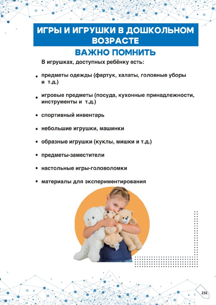В дошкольном возрасте игры, игрушки и игровые материалы более разнообразны и имеют большее значение. Это, прежде всего, образные игрушки (разнообразные куклы, мишки, зайцы, роботы и др.). Они являются удобными объектами для реализации роли: с мишкой можно пойти в разведку, искать клады; куклу можно лечить, как доктор и укачивать спать, как мама и др.